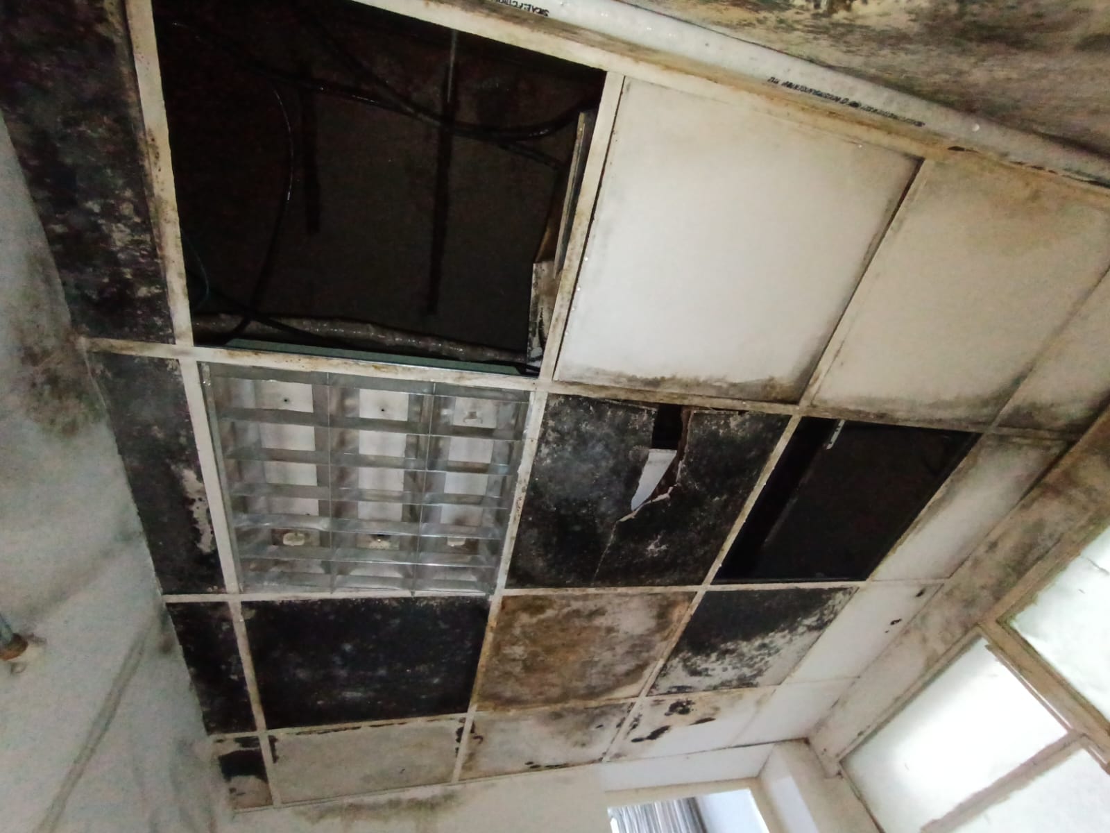 El relevamiento técnico evidenció desprendimiento de membranas impermeabilizantes, embudos pluviales insuficientes y corroídos, deficiencias en pendientes y canaletas, además de flexión estructural en sectores de cubierta de chapa con acumulación de agua. También se constataron filtraciones activas que afectan cielorrasos, instalaciones eléctricas, revestimientos y pisos.