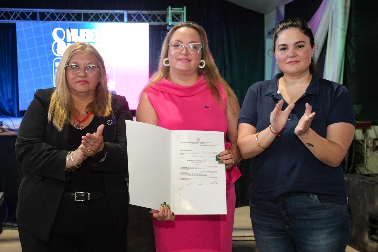 Durante el acto se otorgó el reconocimiento a la Mujer Destacada del Año a Laura Corro, de Villa Berthet, titular de la Fundación Construirme, institución que se dedica a la elaboración de pelucas oncológicas para acompañar a mujeres que atraviesan tratamientos contra el cáncer. La distinción fue recibida por la referente de la fundación, Gladys Sánchez, quien destacó el trabajo solidario que la organización desarrolla para fortalecer la autoestima y la calidad de vida de quienes atraviesan procesos de salud complejos.